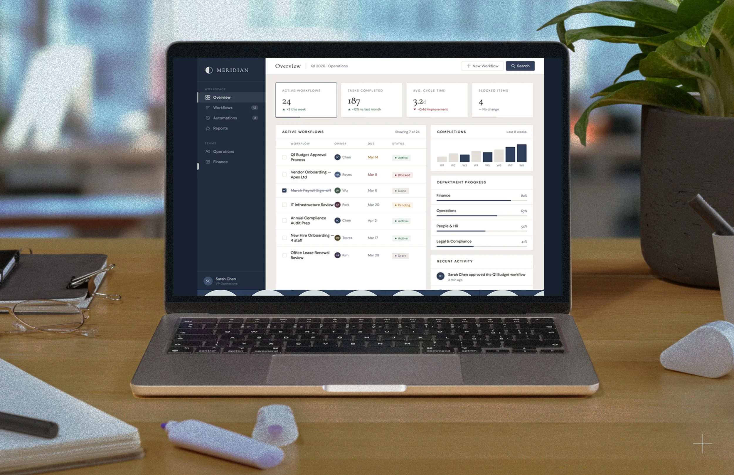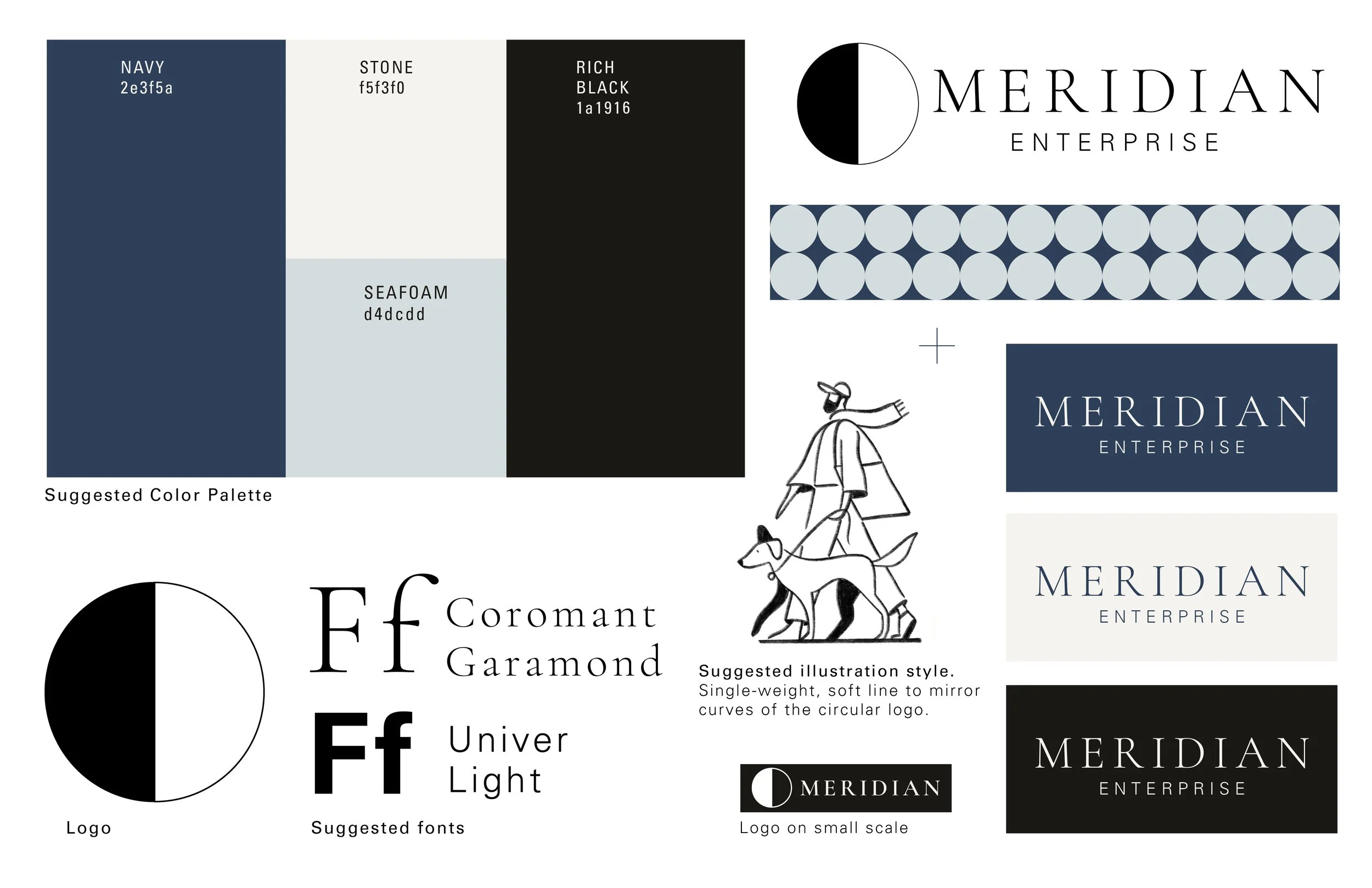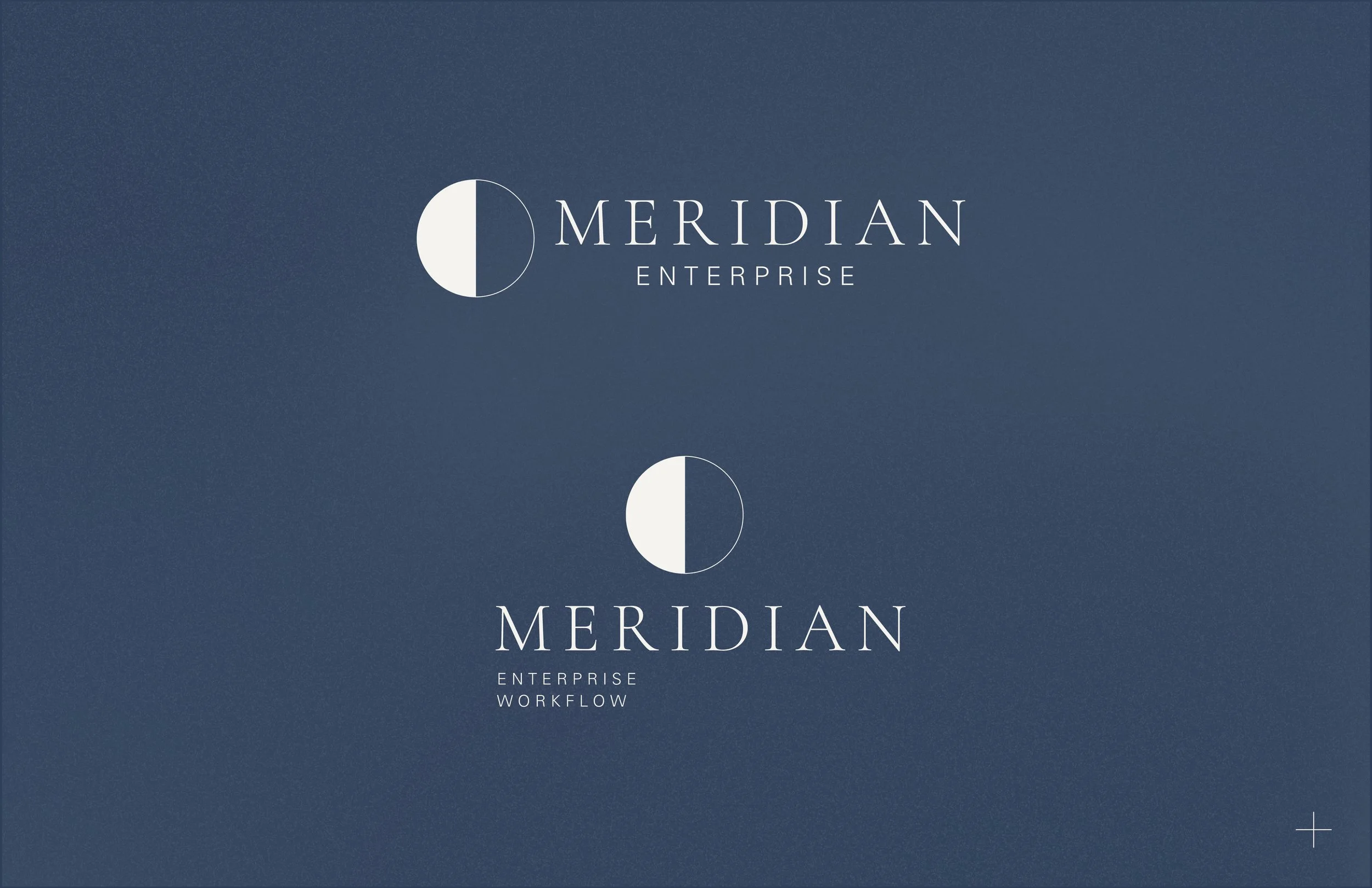 A B2B SasS Meridian automates internal workflows for enterprise teams. The core value proposition is taking something complex and making it feel resolved — bringing order to messy, fragmented processes. The bisected circle speaks to this directly. A circle is inherently complete and unified, and the line cutting through it suggests a clear division between two states: chaos and clarity. Key branding words were calm, thoughtful, restrained, and corporate.